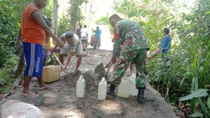 Kopda La Dahlan Babinsa Koramil 1513-01/Piru bersama warga melaksanakan gotong royong dalam rangka melakasanakan pengecoran jalan usaha tani yang sepanjang + 100 Meter di Dusun Olas, Desa Lokki, Kecamatan Huamual, Kabupaten Seram Bagian Barat, Selasa (18/12/2023).