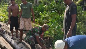 Guna menciptakan kemanunggalan TNI dengan rakyat, Babinsa Koramil 1513-01/Piru, Serda Saman Wabula melaksanakan kegiatan bakti yakni gotong royong membuat jembatan darurat dari batang kelapa di Dusun La ala, Desa Lokki, Kec.Huamual,Kamis (14/12/2023).