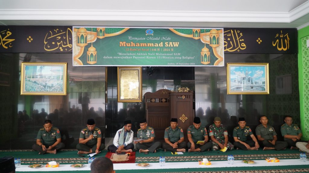 Seluruh Prajurit ,PNS dan Pengurus Persit Korem 151/Binaiya, Melaksanakan kegiatan peringatan Maulid Nabi Muhammad Saw dengan tema “Meneladani Akhlak Nabi Muhammad Shollallahu’ Alaihi Wasallam Dalam Mewujudkan Personel Korem 151/Binaiya Yang Religius.” Yang bertempat di Masjid Salahuddin Makorem,Jln Jendral Ahmad Yani, ,Kel. Batu Gajah, Kec. Sirimau, Kota Ambon, Prov. Maluku (18/09/2024).